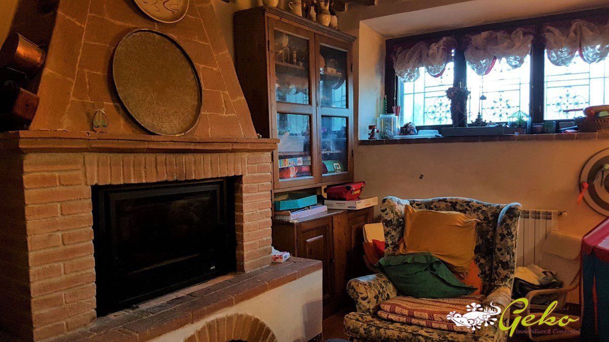 The house has independent utilities (water, electricity, LPG) and air conditioning on the upper floor. The kitchen area features a traditional wood-burning stove, and the living area includes a thermo-fireplace that helps distribute warm air on the ground floor, ensuring a comfortable temperature throughout the home with low energy costs.