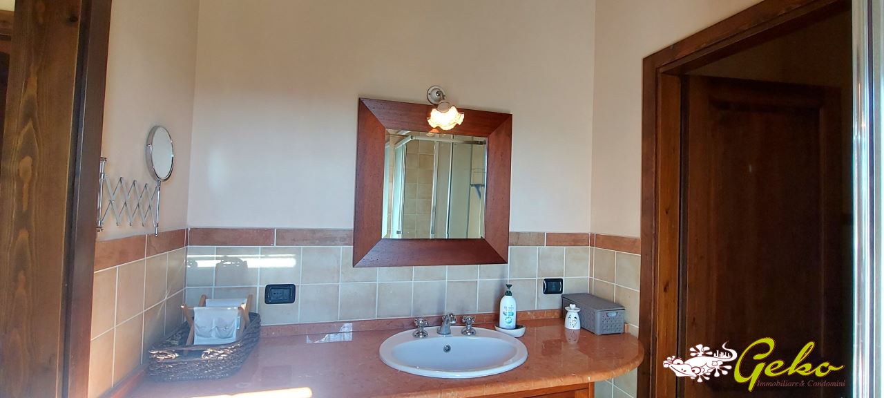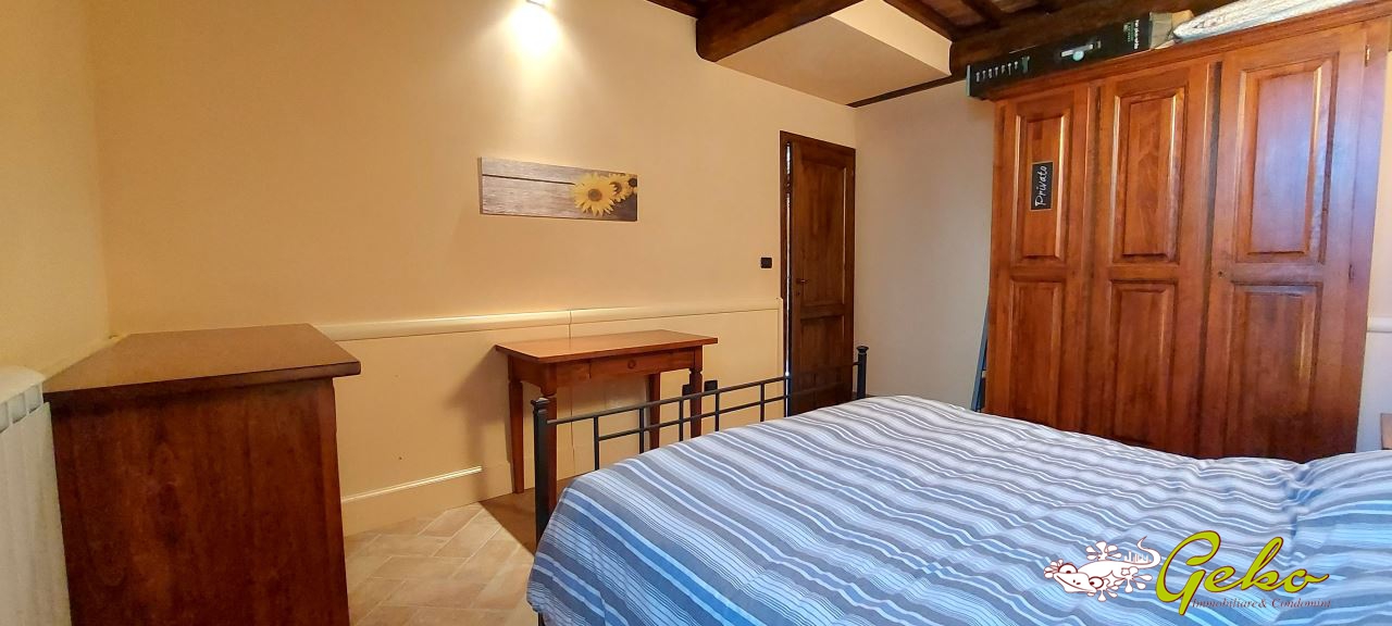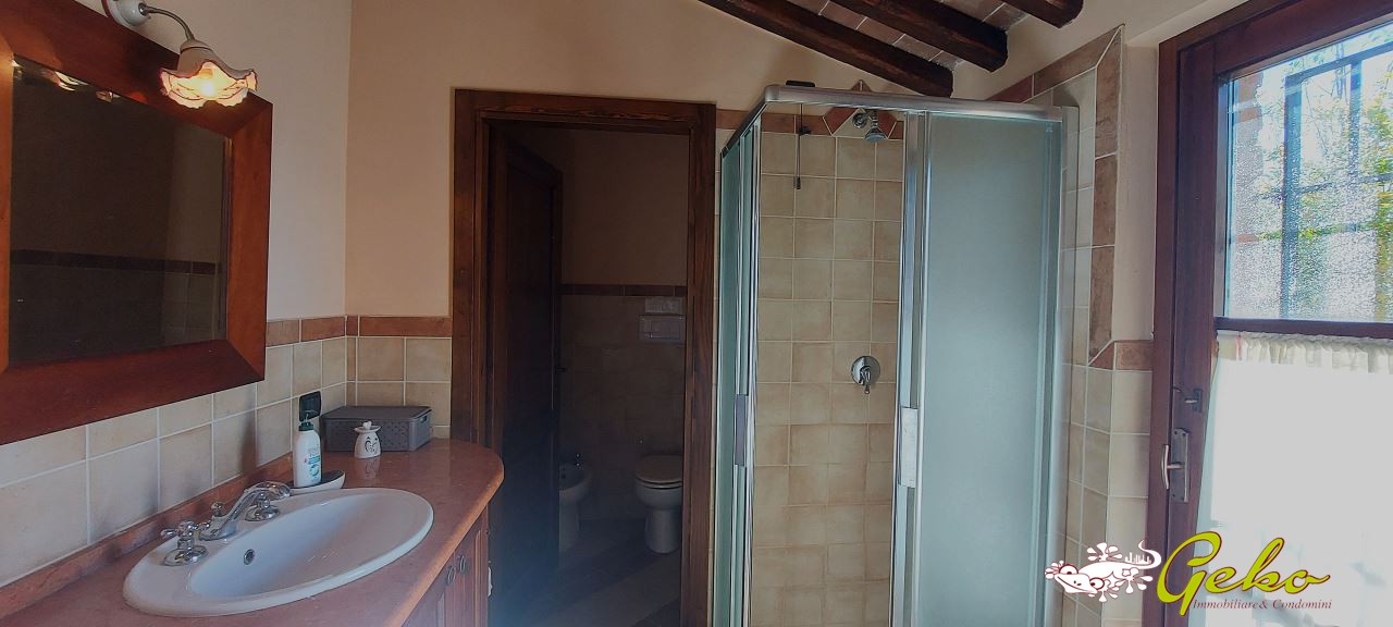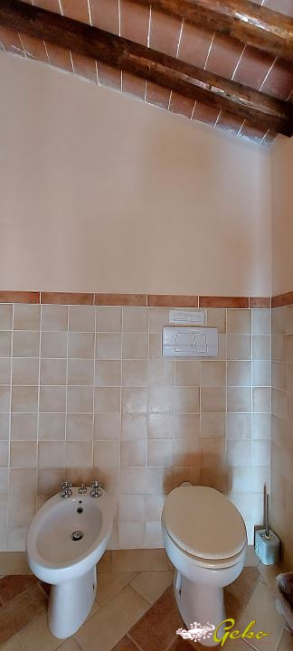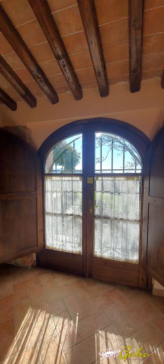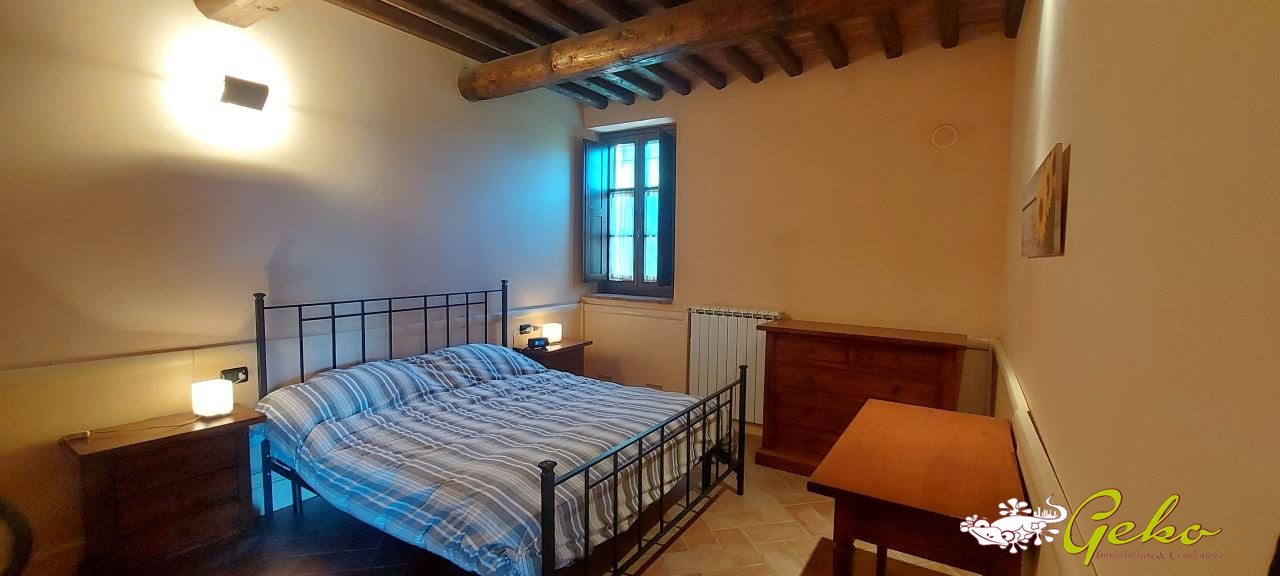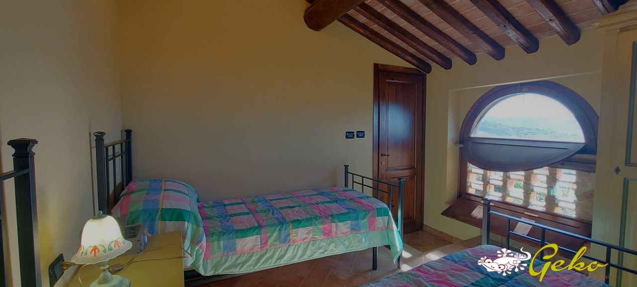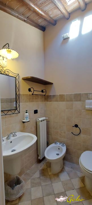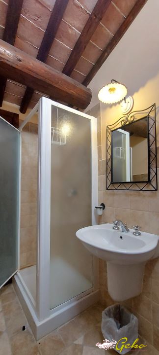Una scala in mattoni conduce al piano superiore, dove lucernari e aperture ad arco - alcune con tipico grigliato toscano - illuminano gli ambienti, esaltando la suggestione rurale dell' immobile. Qui si trovano due ampie camere e un ulteriore bagno con doccia.