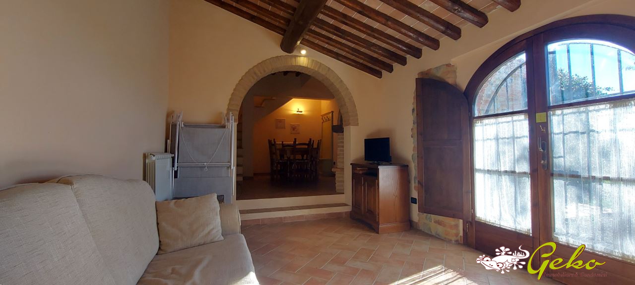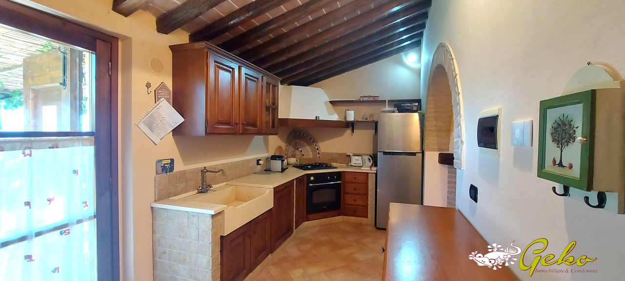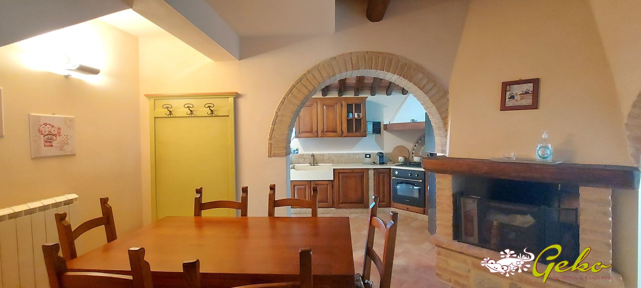All' interno, la cucina completamente attrezzata si apre sulla zona pranzo, impreziosita da un caratteristico caminetto a legna che dona calore e atmosfera all'ambiente. Scendendo un gradino si accede all'ampio salotto, illuminato da una portafinestra che conduce direttamente al giardino. Gli archi in mattoni che separano i vari ambienti i soffitti con travi in legno, creano un'armoniosa continuità e un'elegante sensazione di equilibrio e accoglienza.